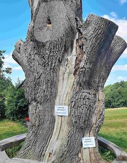 Der Eichentorso bei Hof Paffrath im Wissener Stadtteil Köttingerhöhe hat Zuwachs bekommen. Seit einiger Zeit leben gleich zwei Hornissenvölker in dem Stumpf und fühlen sich dort offensichtlich recht wohl. Es summt und brummt ganz ordentlich im Umkreis des Stamms, was so einige Neugierige anlockt. Eines der Nester ist sogar gut zu erkennen und wächst mit jedem Tag. Das andere befindet sich tiefer im Holz und zeigt sich nur durch starken „Publikumsverkehr“. Hornissen sind die größten heimischen Faltenwespen und stehen unter Schutz. Sie sind durchaus wehrhaft, wenn es um die Verteidigung ihrer Unterkunft geht. Vorsicht ist also geboten. Im Normalfall nehmen sie jedoch Menschen gar nicht wahr. Um allen Umwägbarkeiten aus dem Weg zu gehen, rund um den Stamm lädt eine Bank zum Verweilen ein, hat die Verwaltung umgehend Warnschilder angebracht: „Vorsicht Hornissen! Bitte Abstand halten!“ Erwähnenswert ist noch, dass die Tiere eine wichtige Rolle im Naturhaushalt spielen und unbedingt geschützt werden müssen. (bt)