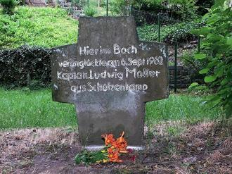 Nach einem anstrengenden Ferienlager für junge Menschen in Österreich suchte er für eine einige Tage Erholung im Haus seiner Eltern, die mit sechs weiteren Geschwistern in Hof Schützenkamp auf der Birkener Höhe wohnten. „Die Jugendlichen warten auf mich“, lautete sein Motiv für die frühe Abreise zurück zu seiner Wirkungsstätte im Ruhrgebiet. Zuvor besuchte der Kaplan noch den so verehrten und allseits bekannten Pfarrer Rektor Franz Mohnen in Birken-Honigsessen. Gleich anschließend fuhr ihn sein Vater in Richtung Wissener Bahnhof. Am Bröhlbach unmittelbar neben der früheren Grubenbahnstrecke und in Sichtweite des Friedheims geschah das Unfassbare. Der Traktor stürzte ins Wasser und begrub Ludwig Müller unter sich. Eine Rettung war nicht möglich. Vater Josef erlitt schwere Verletzungen. Wenige Wochen später stellte man am Unglücksort ein Steinkreuz auf, das bis heute an das zwar kurze aber segensreiche Leben von Kaplan Ludwig Müller erinnert. (Bernhard Theis)