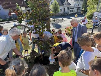 Ein wunderschöner Eisenholzbaum hat zu Ehren einer neuen Ära der Barbara-Grundschule in Katzwinkel mit Einschulung der Erstklässler seinen neuen Platz gefunden. Am "Außenklassenzimmer", wie Ortsbürgermeister Hubert Becher den Bereich rund um die Schaustollenanlage direkt neben der Grundschule nennt, wurde er gemeinsam mit den Kindern im Anschluss an die Feierlichkeiten in der Glück-Auf-Halle gepflanzt.