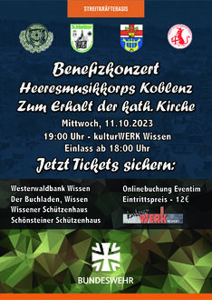 Das Heeresmusikkorps Koblenz hat sich direkt dazu bereiterklärt am 11.10.2023 zu einem Benefizkonzert nach Wissen zu reisen. Mit seinem fünfzigköpfigen sinfonischen Blasorchester ist das Heeresmusikkorps Koblenz der musikalische Botschafter der Bundeswehr in Rheinland-Pfalz, dem Saarland und auch weit darüber hinaus. Bei den traditionellen militärischen Zeremoniellen wie Feierlichen Gelöbnissen, Kommandoübergaben, Appellen und dem Protokollarischen Ehrendienst sorgt das Musikkorps für den feierlichen Rahmen, stärkt den Zusammenhalt der Truppe und unterstützt hiermit die Repräsentanz und Integration der Bundeswehr in der Bevölkerung. Mit seiner Musik repräsentiert der Klangkörper die Streitkräfte in der Öffentlichkeit durch Benefizkonzerte, Rundfunk- und Fernsehauftritte sowie bei den Musikshows bei Militärmusik-Tattoos im In- und Ausland.