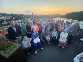 Die Gäste aus Letchworth mit ihren Wissener Gastgeberinnen und Gastgebern anlässlich des 40-jährigen Bestehens der Städtepartnerschaft Letchworth (England) und Wissen auf der Dachterrasse des Walzwerks Wissen