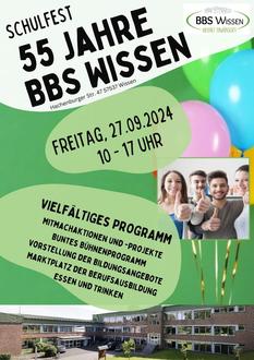 In diesem Jahr blickt die Berufsbildende Schule Wissen auf ihr 55-jähriges Bestehen zurück. Dieses besondere Ereignis wird in Form eines Schulfestes am Freitag, 27.09.2024, in der Zeit von 10:00 Uhr bis 17:00 Uhr gefeiert. Die Vielfalt der an der BBS Wissen angebotenen Bildungsangebote werden am Schulfest durch die Klassen und Schülergruppen vorgestellt. Es gibt ein Bühnenprogramm auf dem unteren Schulhof und viele Mitmachaktionen in den Klassen- und Fachräumen sowie auf dem gesamten Schulgelände. Dank der Klassen im Bereich Hauswirtschaft ist für das leibliche Wohl bestens gesorgt. Im Sinne einer gelebten Lernortkooperation wird mit 50 Ausbildungsbetrieben, Verwaltungen, Kitas und Pflegeeinrichtungen die Berufsorientierungsmesse „Marktplatz der Berufsausbildung“ angeboten. Diese findet in der Sporthalle direkt unterhalb des Schulhofs statt. Das Schulfest startet mit allen Anwesenden am 27.09.2024 um 10:00 Uhr auf dem unteren Schulhof vor der Bühne. Alle sind an der BBS Wissen herzlich willkommen - Vielfalt erwünscht!