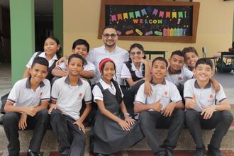 Pater Dario Codina SDB, Direktor des Sozialzentrums Don Bosco in Barranquilla, Kolumbien, mit seinen Schülern.