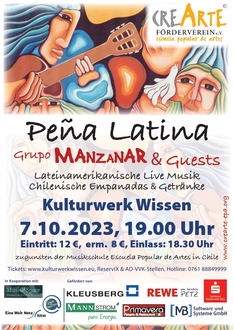 Die Gruppe Manzanar wird mit weiteren Gastmusiker.innen auftreten und das Publikum auf eine musikalische Reise durch den Kontinent Lateinamerika mitnehmen. Mit dabei sein werden: Eduardo Cisternas - Gitarre, Charango, Cuatro, Tres, Tiple & Gesang; Michaela Weyand - Querflöte, Quena & Gesang; Diego Furian - E-Bass & Kontrabass, Marcelo Bellas - Schlagzeug; Azuzena Alvarez - Latin Perkussion; Constanza García - Querflöte, Quena & Zampoña; Cristian Faig - Querflöte, Klavier & Gesang; Oscar Vega - Charango, Quena, Zampoña; sowie César, chilenischer Liedermacher aus Brüssel. Der Förderverein CREARTE e.V. bietet chilenische Empanadas und Getränke an.