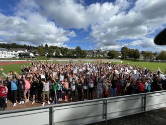 Stolz halten die rund 550 Schüler ihre Urkunden zum Sponsorenlauf „Spiel, Spaß, Sport - Mit uns in Wissen läufts“ in die Höhe.