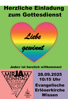 | Wissen | 10.15 Uhr: | Gottesdienst Miriamsonntag „Liebe gewinnt“; Pfarrerin Martina Kaiser und Diakonin Svenja Spille unter Mitwirkung des Posaunenchores |