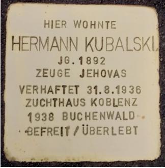 Geboren wird Hermann Kubalski im Jahre 1892 in Grondzwa im heutigen Polen. Schon bald kommt er nach Wissen und arbeitet dort als Schlosser. Als überzeugter Bibelforscher, wie Jehovas Zeugen damals genannt wurden, geht er von Haus zu Haus und spricht mit den Menschen über die Botschaft der Bibel. Das ändert auch das staatliche Verbot der Religionsgemeinschaft nicht: Hermann Kubalski lässt sich nicht von seiner christlichen Überzeugung abbringen und lehnt sämtliche Beteiligung an politisch motivierten Aktivitäten sowie den Kriegsdienst entschieden ab. Als die Gestapo am 31. August 1936 ein eigenes Sonderkommando zur Verfolgung von Jehovas Zeugen bildet, wird Kubalski verhaftet und vom Sondergericht in Koblenz zu einer Gefängnisstrafe von einem Jahr und vier Monaten verurteilt. Doch nach Verbüßung der Strafe wird er nicht entlassen, sondern in „Schutzhaft“ genommen und in das Konzentrationslager Buchenwald überführt.