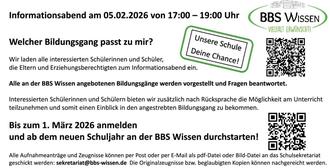 Für die BBS Wissen beginnt nun die heiße Phase der intensiven Bewerbung des erweiterten Bildungsangebotes. Alle umliegenden Schulen werden über das Bildungsangebot informiert. Geworben wird in den sozialen Medien und auf der Schulhomepage. Ebenso werden alle interessierten Schülerinnen, Schüler und deren Eltern zum Beratungsabend, am Donnerstag, 5. Februar ab 17:00 Uhr, eingeladen. Ebenso kann ein persönlicher Beratungstermin mit Frau Schimmel, an der BBS Wissen zuständig für das Berufliche Gymnasium, vereinbart werden.