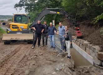 Am neu erstellten Einlaufbauwerk des Köttingsbachs: v. l. Tobias Bader und Denis Schomber (Firma Bader), Thomas Reuber (VGV Wissen), Sebastian Träger (Stadtwerke Wissen GmbH) und Margit Broschk (VGV Wissen)