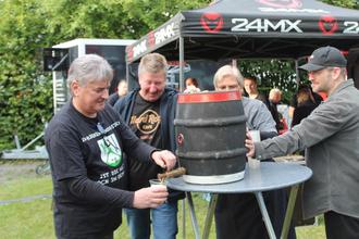 Der Vorsitzende des neuen Vereins „Kultur durch Musik e.V.“, Michael Kölzer, beim Fassanstich, der das „Ahl-Ehsch-Festival“ auf der“Birker Hüh“ eröffnete.
