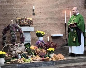 Kapłan Andrzej Bednarz, der erst kürzlich seine Arbeit im Seelsorgebereich Obere Sieg aufgenommen hat, segnete die Gaben gleich zu Beginn der Messfeier im feierlichen Rahmen. Noch bis Ende Oktober bleibt die eigens für die Kirche mit Erika gebundene Erntekrone in der Kirche, um damit die Dankbarkeit für die diesjährige gute Ernte auszudrücken. (KB)