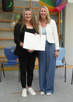 Verleihung der Urkunde, links Heidi Bordach (neue Schulleiterin), rechts Nicole Lohse (Schulaufsicht ADD)