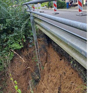 Durch die letzten Starkregenereignisse wurde die Straße „In der Deubach“ an einer Seite stark unterhöhlt, während sich auf der anderen Seite der Asphalt angehoben hat. Auch die angebrachte Leitplanke am ca. 4 m tiefen Abhang wurde freigespült. Daraufhin erfolgte im Rahmen der Verkehrssicherungspflicht eine Straßensperrung zur Absicherung. Leider mussten wir wiederholt feststellen, dass die Sperrung nicht beachtet wurde und die Sperrböcke und Warnbarken verschoben wurden, um die Straße trotz Sperrung zu befahren.