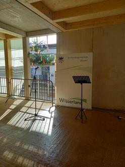 Im Anschluss begaben sich die Ratsmitglieder dann zum Richtfest des neuen Rathauses. Zu der Feier hatten sich neben den Ratsmitgliedern, Mitarbeitende des Rathauses und Vertreter der beteiligten Unternehmen eingefunden. Der Projektleiter bei der Verbandsgemeinde, Marc Eichhorn, sowie Vertreter des Architekturbüros Heimspiel aus Münster, Marc Matzken und Bauleiter Alexander Osthues, waren auch zum Richtfest gekommen, ebenso wie die fünf Ortsbürgermeister sowie die Beigeordneten.