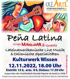 Am Samstag, den 12.11.2022 wird der Förderverein CREARTE e.V. um 18 Uhr im Kulturwerk Wissen eine Benefizveranstaltung mit lateinamerikanischer Live Musik und chilenischen Spezialitäten veranstalten.