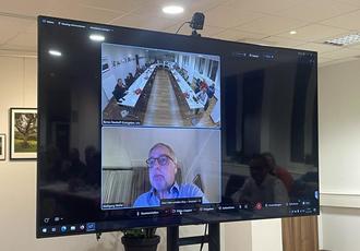 Fachanwalt Wolfgang Weller berichtet per Video zugeschaltet zum Sachstand „Rissbildung in der Rathausstraße“ in Wissen.