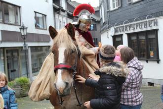 St. Martin verteilte um 15.00 Uhr „hoch zu Ross“ auf dem Marktplatz Weckmänner an die Kinder. Pünktlich um 18 Uhr führt er dann - ebenfalls auf seinem Pferd - den Fackelzug mit musikalischer Unterstützung der Feuerwehrkapelle vom Marktplatz aus zum großen Martinsfeuer auf den Schützenplatz.