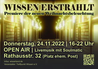 Gestartet wird in den vorweihnachtlichen Abend bereits um 16 Uhr auf dem Platz vor der ehemaligen Post (Rathausstraße 32). Pünktlich um 17 Uhr heißt es dann „Wissen erstrahlt“ und die fast 40 Sternenschweife werden die Rathausstraße vom Europakreisel bis Am Biesen in stimmungsvolles Ambiente versetzen.