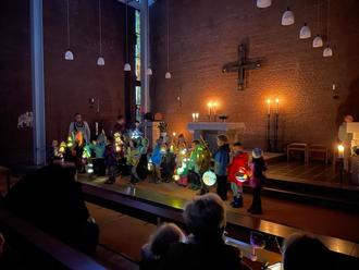 Nach dem Wortgottesdienst in der Barbara Kirche Katzwinkel ging der hell und bunt erleuchtete Umzug mit Musik und Sankt Martin hoch zu Ross Richtung Schützenplatz.
