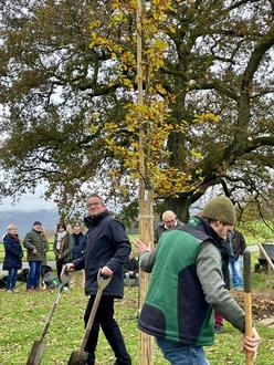 Rund 100 Menschen waren gekommen, um der Pflanzung des direkten Nachkommen der Eiche beizuwohnen. Damit ist das Trio wieder komplett und der "Junge Riese" kann im Schutz der beiden großen Eichen und des verbliebenen Torsos auf der Köttinger Höhe Wurzeln schlagen. Neues Leben ist in der Gruppe des Naturdenkmals - geführt unter der Nummer 7132-381 - eingezogen. Gleichzeitig bekam der Zweite der beiden einzigen Abkömmlinge auf dem gegenüberliegenden Grundstück der Stadt Wissen seinen neuen Platz.
