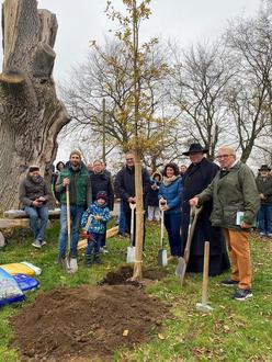 Das Trio beim Naturdenkmal "Eichengruppe auf der Köttingerhöhe" (Paffrather Eichen) ist wieder vollständig. Dort, wo sich "Wege und Geschichten bündeln", wurde während einer Feierstunde am Samstag (9. November) ein direkter Abkömmling der im April unter großer Anteilnahme der Bevölkerung bis auf den Torso gefällten mächtigen Eiche gepflanzt.