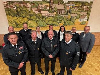Reihe vorne v. l.: Volker Hain (Katzwinkel) - 35 Jahre, Peter Buchen (Schönstein) – 35 Jahre, Thomas Herzog (Wissen) 45 Jahre!, Martin Trapp (Schönstein) – 35 Jahre Zweite Reihe v. l.: Wehrführer Steffen Schmidt (Schönstein), stellvertretender Wehrführer Sebastian Velten (Katzwinkel), Christina Herzog, Wehrführer David Musall (Wissen), Sonja Trapp, Wehrleiter Stefan Deipenbrock und Bürgermeister Berno Neuhoff