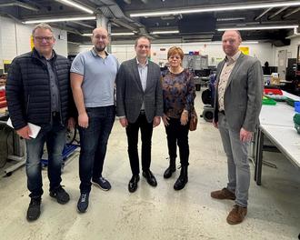 v. l.: Bürgermeister Berno Neuhoff, Werkstattleiter Tobias Baumeister, Geschäftsführer Michael Blachut, Bettina Grothe (Mitglied im geschäftsführenden Vorstand der Westerwald-Werkstätten), Johannes Rudolph (Leiter Netzregion EAM).