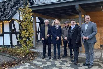 Der Präsident der ADD Trier, Thomas Linnertz (zweiter v.r.) besuchte das Wisserland. Hier mit von links: Hubert Becher, Kerstin Roßbach, Werner Holschbach und Berno Neuhoff am Backes in Elkhausen.