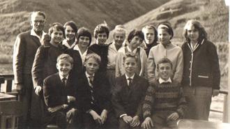 Im März 1965 beendeten dreizehn junge Damen und Herren, hier mit Lehrer Josef Ellerich, ihre Schulzeit auf der Köttingerhöhe.