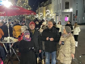 Teils hatten sich ganze Belegschaften von Firmen eingefunden und nach 18 Uhr füllte sich der Platz noch einmal mehr. Neben Thomas Kölschbach (Erster Vorsitzender der Aktionsgemeinschaft) begrüßte auch Bürgermeister Berno Neuhoff die Gäste. Sich über die große Besucherzahl und auch in diesem Jahr neu dazugekommene Sternenschweife freuend, dankte Kölschbach den vielen Firmen, die mit dem Kauf derselben die Weihnachtsbeleuchtung überhaupt möglich machten. Ebenso der Stadt, die mit der Erneuerung der Rathausstraße für mehr Attraktivität in der Innenstadt sorgt. Rund um die Organisation des Events hatten sich innerhalb der Aktionsgemeinschaft das Projektteam mit Britta Bay, Bernd Wagner, Manfred Kern und Detlef Schuhen federführend um das Event gekümmert.