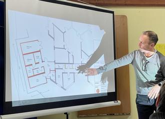 Tarek Petri zeigt mögliche Varianten für einen Umbau in der Kita Löwenzahn in Katzwinkel.