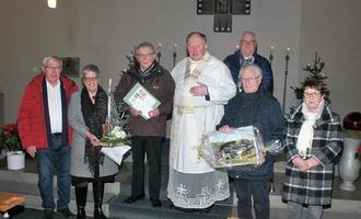 Verabschiedet worden ist Hans-Josef Greb (3. von li.) unter anderem von: Bruno Schmidt (Kirchenvorstand), Sabine Köhler (Kirchenchor Schönstein) und Dechant Martin Kürten sowie Ernst Dornhoff und Margret Vogel (beide Kirchenchor Elkhausen). Hinten steht Thomas Marciniak (Schönstein).