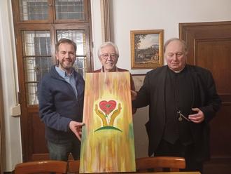 Der in Wissen lebende Künstler Gerhard Gröner hat mit einer besonders schönen Aktion einen persönlichen Beitrag dazu geleistet, dass das Spendenbarometer für die neue Orgel in der Pfarrkirche Kreuzerhöhung weiter dem Ziel entgegen steigen kann. Er schenkte der Pfarrgemeinde eines seiner Werke (Acryl 80x40). Die „Pflanze der Hoffnung“, wie dieses Bild heißt, habe ihn dazu bewogen, genau dieses Werk auszuwählen und damit ebenfalls allen Menschen Hoffnung zu machen, dass die Pfarrkirche in wenigen Monaten wiedereröffnet werden kann. Die stilisierten Motive Herz, schützende Hände und aufkeimende Pflanze, stehen für Liebe/Herzlichkeit, Fürsorge und Hoffnung und seinen genau das, was angesichts einer solchen Brandkatastrophe den Geschädigten entgegengebracht werden müsse. „Die Zierde und der wunderschöne Klang der Kreuzerhöhungs-Kirche wurden bösartig beschädigt“, so Gröner, und da habe er handeln müssen. Am vergangenen Mittwoch überreichte der Künstler sein Bild an Pfarrer Martin Kürten und Seelsorgebereichsmusiker Andreas Auel. Kürten zog Parallelen zu den Fresken von Peter Hecker, im speziellen zum Bild über dem Eingang zur Kriegerkapelle unter der Orgel. „Auch dort wächst aus den Trümmern eine Rose der Hoffnung“ so der Pfarrer in seiner Dankesrede an Gröner. Von den 64.000€, die die Pfarrei als Eigenleistung für die Orgel erbringen muss, fehlen noch 6000€. Kürten und Auel zeigten sich aber hoffnungsvoll, dass auch dieser Betrag bis zum Beginn der Aufbauarbeiten in Wissen im nächsten Frühsommer zusammenkommen wird.