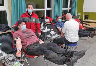 Andreas Herzog (li.) war zum zweiten Mal dabei, Norbert Leidig (hinten) ist mit 46 Spenden schon ein „alter Hase“. Betreut wurden sie von Angehörigen der Rotkreuz-Bereitschaft Birken-Honigsessen in der örtlichen Grundschule.