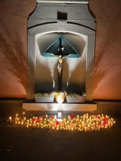 Ein eindrucksvolles Zusammenstehen mit Gebet, einer Geste des Verzeihens von Dechant Martin Kürten für den oder die Täter sowie Gedanken der Solidarität für die Kath. Kirche, unsere Stadt Wissen mit beiden Kirchen, Menschen, Vereinen am Freitagabend , 10. Februar, vor der Kath. Pfarrkirche Kreuzerhöhung und deren vernichteten jahrhundertealten Kulturgütern (Altar) und den Fresken des berühmten Kölner Malers Peter Hecker, die heute beim Brand teilweise unwiederbringlich vernichtet wurden.
