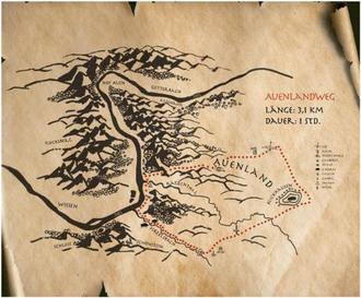 Die Karte zeigt den Verlauf des rund 3 km kurzen Rundweges Auenlandweg, der mit aufwändig geschnitzten Fabelwesen der Tolkien-Bücher auf die Besucher wartet. Diese kommen übrigens von nah und fern, und kehren nach der Wanderung häufig noch in der heimischen Gastronomie ein. Jüngste Figur ist Sauron, der erneut zahlreiche Wanderer und Fans anlockt.