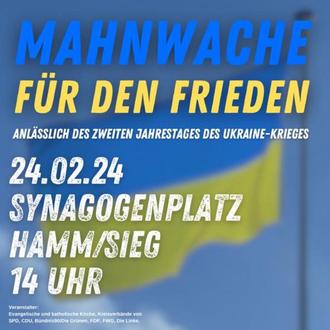 Der Kriegsbeginn jährt sich am Samstag, dem 24. Februar, zum zweiten Mal. Anlässlich des schrecklichen Jahrestages rufen alle demokratischen Parteien aus dem Kreis Altenkirchen, die evangelische und katholische Kirche aus dem Kreis Altenkirchen zu einer Mahnwache für den Frieden auf. Diese findet am kommenden Samstag, den 24. Februar, um 14.00 Uhr auf dem Synagogenplatz in Hamm statt. Mit dem Gedenken soll an alle Opfer dieses Krieges erinnert werden. "Wir dürfen uns niemals an diesen Krieg gewöhnen", so erläutern die Veranstalter ihre Initiative und Beweggründe für die Mahnwache.