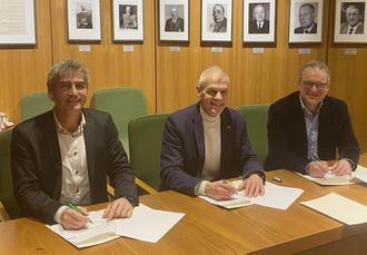 Feierliche Unterzeichnung der Zweckvereinbarung: Die Bürgermeister Dietmar Henrich (Hamm), Fred Jüngerich (Altenkirchen-Flammersfeld) und Berno Neuhoff (Wissen) besiegeln die interkommunale Zusammenarbeit der Zentralen Vergabestelle.