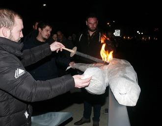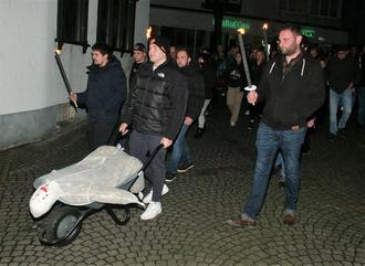 Nun ist die Karnevalssession 2022/23 endgültig abgehakt. Pünktlich um 18.11 Uhr am Aschermittwoch begann auf dem Wissener Marktplatz die trübe jeckenlose Zeit. Eine große Abordung der heimischen KG und viele Freunde aus der Partnerstadt Chagny hatten sich eingefunden um Abschied zu nehmen. Die frühere Sitzungspräsidentin Lisa Trapp sagte es in etwa so: „Du böser Karneval hast uns das Geld aus der Tasche gezogen und sollst Deinem verdienten Schicksal nicht entgehen“. Dann machte sich der Trauermarsch zu den dumpfen Trommelschläger des Spielmannszugs „Alte Kameraden“ auf den Weg zur Siegbrücke im Unterdorf. Das mit Stroh ausgestopfte „Karnevalsmensch“ fuhr praktischerweise in einer Schubkarre mit. Auf der Brücke übergoss Robin Stricker, KG-Geschäftsführer und frisch gebackener Träger des städtischen Karnevalsorden die Puppe mit Spiritus und zündete sie mit einer Fackel an. Das lichterloh Mensch fiel kopfüber ins Wasser und dürfte irgendwann in den Rhein gelangen. Auf dem Rückweg ins Vereinslokal klang der Spielmannszug dann wesentlich freundlicher. Und spätestens beim gemeinsamen Fischessen hatten die Karnevalisten zu ihrer guten Laune zurückgefunden. (bt)