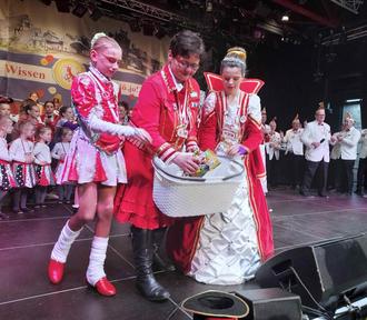 Prinzessin Franziska I. (re.) und ihre Adjutatin Marie beim Verteilen von Kamellen bei der Kindersitzung. Die KG-Vorsitzende Marion Schwan half kräftig mit.