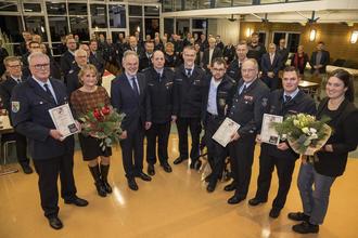 Feierlich verabschiedet und zugleich zum Ehrenwehrleiter der Verbandsgemeinde Bad Marienberg ernannt wurde Wehrleiter Klaus Groß (3.v.r.) durch Bürgermeister Andreas Heidrich (3.v.l.), der im Rahmen einer kleinen Feierstunde dessen Nachfolger Frank Schiffmann (links) sowie den neuen Stellvertreter Tobias Schüler ernannte (2.v.r.). Zu den ersten Gratulanten zählten deren Ehefrauen und der Brand- und Katastrophenschutzinspekteur des Westerwaldkreises Tobias Haubrich und dessen Stellvertreter Markus Brenner und Michael Itzek (4.-6.v.r.).