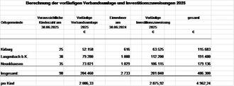 Der Finanzmittelfehlbedarf für die Unterhaltung und Verwaltung des Kindergartens wird im Wege der jährlichen Verbandsumlage abgedeckt. Umlagemaßstab ist die Zahl der im Abrechnungszeitraum mit Stichtag vom 30.06. des Haushaltsjahres im Kindergartenalter befindlichen Kinder der Gemeinden.