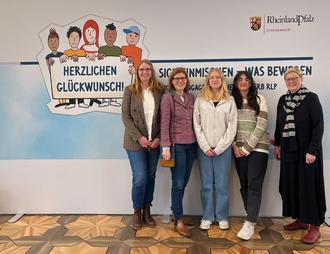 Die beiden Schülerinnen Nada Albalkhi und Nicole Michajlow (2. u. 3. v.r.) nahmen den Preis für die Jugendscouts der Marie-Curie-Realschule plus Bad Marienberg entgegen. Bei dem Projekt werden sie von Ulrike Wilde, Präventionslehrerin (2.v.l.) und Tanja Woiner, Schulsozialarbeiterin (links) unterstützt und begleitet. Die Beigeordnete der Verbandsgemeinde Bad Marienberg Eva Ehrlich-Lingens (rechts) durfte die Gruppe zur Preisverleihung begleiten und freute sich mit den Jugendscouts über die Auszeichnung.
