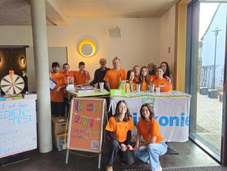 Zusammen mit den derzeitigen Praktikantinnen der Erzieherfachschule, Angelina Ritter (vorne rechts) und Nelly Woizcik (vorne links) freuten sie sich über die vielen Anstöße, die die Aktion geben konnte und die angeregten Gespräche und den Austausch, der darüber unter den jungen Besucherinnen und Besuchern des Events zustande kam. Ihr besonderer Dank galt den sie begleitenden JUBA-Treffbesucher:innen, die auch in diesem Jahr die gelungene Suchtpräventionsaktion bereitwillig als Helferinnen und Helfer unterstützten.
