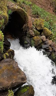Weiter geht der Weg durch den Wald, entlang der großen Nister, zum Wasserauslaufstollen der Grube „Alexandria“.