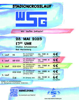 Nächste Woche Mittwoch, dem 28.05.2025, findet der 5. Stadion-Crosslauf der Wäller Sportgemeinschaft im Schul- und Sportzentrum von Bad Marienberg statt. Auch in diesem Jahr wird wieder ein etwa 500 Meter langer Parcours abseits der Laufbahn, der mit unterschiedlichen Hindernissen gespickt ist, zu bewältigen sein. Die Hindernisse machen dabei den Reiz dieses Laufs aus, denn Holzpaletten, eine Slalompassage, Sandgruben, mehrere Stufen auf und ab sowie alte Autoreifen müssen über- bzw. durchquert werden. Auch in diesem Jahr wird die Streckenlänge altersabhängig variieren. So haben die jüngsten Starter eine Runde und die über 18-jährigen insgesamt sechs Runden durch das Stadion zurückzulegen. Selbstverständlich wird die Veranstaltung auch 2025 wieder mit dem inklusiven Ansatz des Vereins ausgetragen. So sind nicht nur „regelentwickelte“ Sportler, sondern ganz besonders auch sport- und laufbegeisterte Menschen mit körperlicher oder geistiger Beeinträchtigung herzlich Willkommen. Die Anmeldung ist ab sofort geöffnet und kann entweder über den abgebildeten QR-Code oder über www.my.raceresult.com/326672/ erfolgen.
