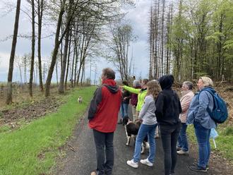 Kira Breyer (Mitte) klärt unmittelbar und direkt vor Ort viele offene Fragen beim informativen Spaziergang durch den frisch aufgeforsteten Wald. Foto: Elke Keller