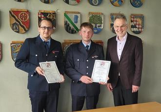 Bürgermeister Andreas Heidrich (rechts) überreichte die entsprechenden Urkunden und dankte Bastian Brückmann, der der Fehl-Ritzhäuser Wehr als Aktiver erhalten bleibt, für die geleisteten Dienste. Dessen Nachfolger Kai Kruschel wünschte er für sein neues Amt alles Gute und viel Erfolg.