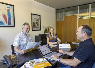 Die Verbandsgemeindeverwaltung stellt für die persönliche Beratung ihre Räumlichkeiten zur Verfügung. Unser Foto zeigt Bürgermeister Andreas Heidrich (links) und Klimaschutzmanagerin Helena Frink (Mitte) im Informationsgespräch mit Energieberater Torsten Schöw von der Verbraucherzentrale Rheinland-Pfalz.