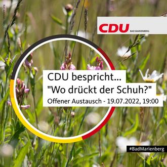 Die CDU Bad Marienberg (Ortsverband) hatte auf der ersten Sitzung des neuen Vorstands Mitte Juni beschlossen, wieder regelmäßig Veranstaltungen durchzuführen. Dafür wird eine neue Veranstaltungsreihe unter dem Namen „CDU bespricht“ eingeführt. Ziel ist es, den Mitgliedern der Partei und interessierten Dritte einen Rahmen für einen form- und zwanglosen Austausch zu aktuellen Themen zu bieten. Dabei sollen alle Themen auf den Tisch kommen, die in Bad Marienberg aktuell relevant sind. Die Mitbürger erhalten so eine weitere Gelegenheit, ihre Anliegen ohne große Umstände mitzuteilen.
